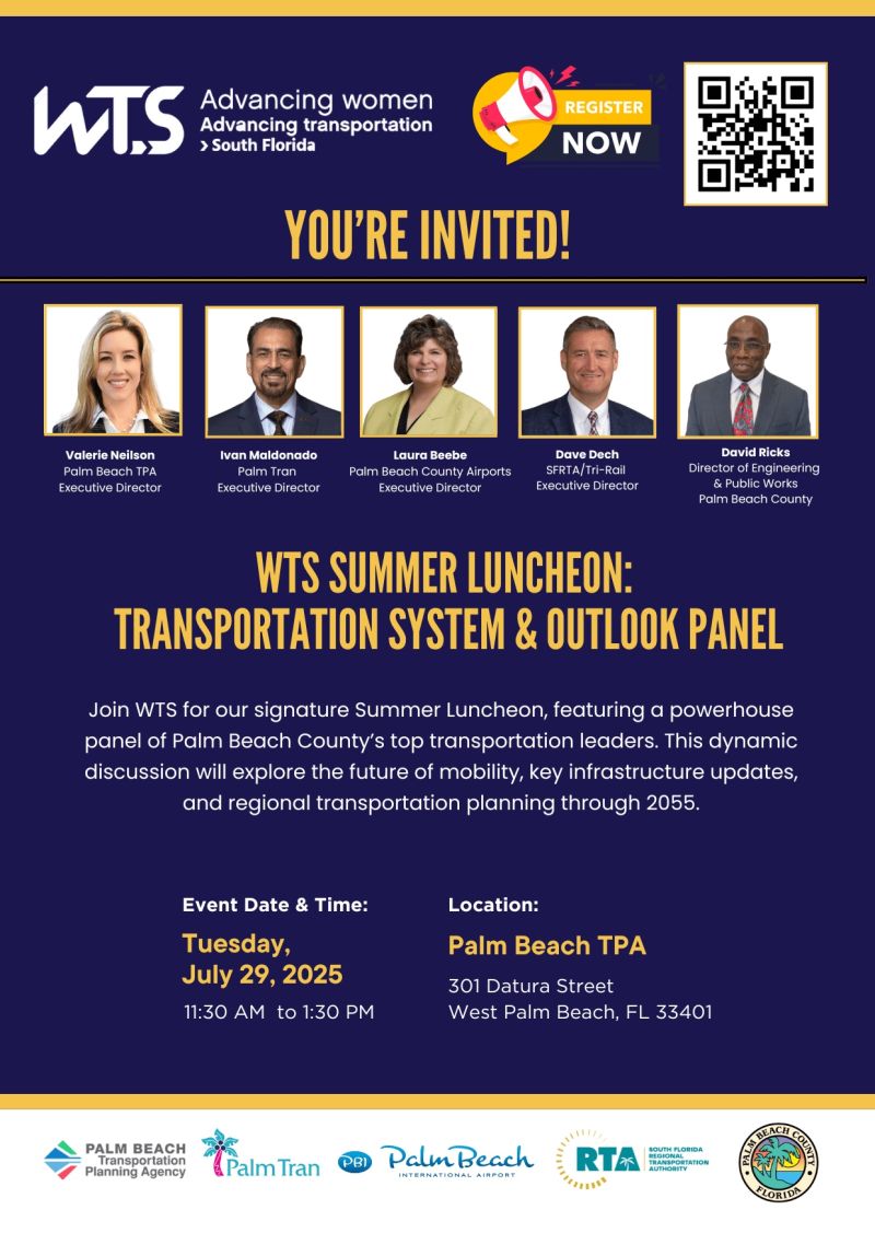 A few spots remain! Join us for the WTS International Summer Transportation Luncheon on July 29 at the Palm Beach Transportation Planning Agency (TPA)✅ We’ll be diving into the future of transportation in Palm Beach County and across South Florida with an incredible panel of leaders: 🚆 Dave Dech, Executive Director, South Florida Regional Transportation Authority / Tri-Rail 🚌 Ivan Maldonado, ND, MBA, Executive Director, Palm Tran ✈️ Laura Beebe, Executive Director, Palm Beach International Airport (PBI) 🛣️ David Ricks, County Engineer, Palm Beach County 🚗 And myself, Valerie Neilson, AICP, Executive Director, Palm Beach Transportation Planning Agency (TPA) 🎟️ Register [...]