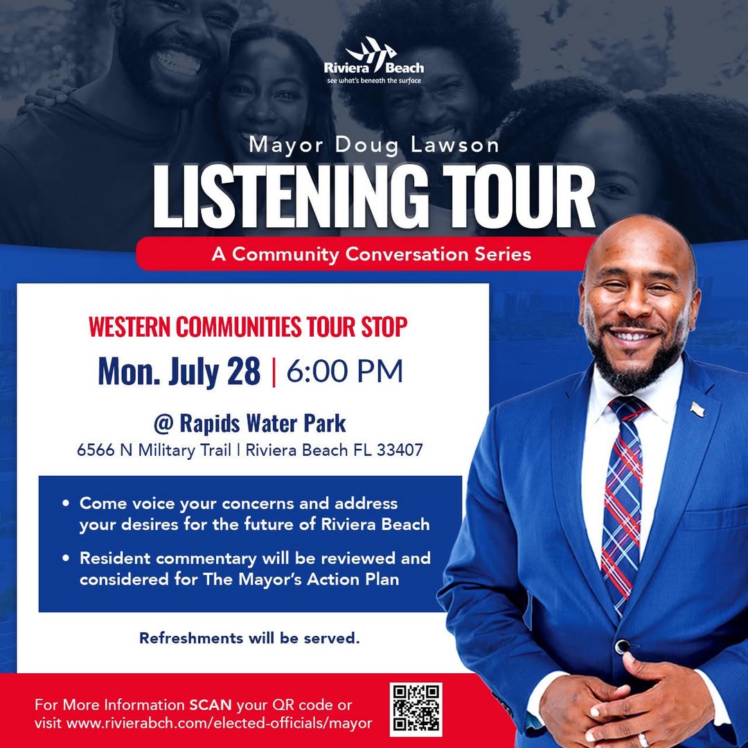 Mayor’s Listening Tour: Western Communities Edition We’re taking the conversation to Rapids Water Park for the next stop on the Mayor’s Listening Tour — because your voice matters. Rapids Water Park Monday, July 28th 6:00 PM This stop is dedicated to our western communities. Come ready to engage, share your concerns, and help shape the future of Riviera Beach. We’re meeting you where you are and we’re listening. Let’s keep building together. See you there! |