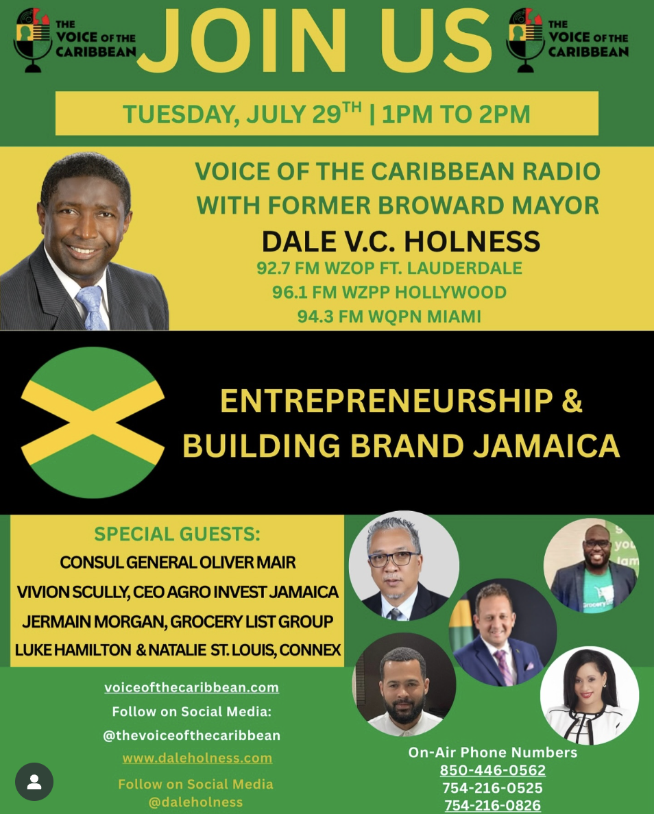 Join “The Voice of the Caribbean” this Tuesday, July 29th from 1PM to 2PM on: 📻 92.7 FM WZOP (Ft. Lauderdale) 📻 96.1 FM WZPP (Hollywood) 📻 94.3 FM WQPN (Miami) We’ll be diving into Entrepreneurship & Building Brand Jamaica with some powerful voices and special guests: Consul General Oliver Mair Vivion Scully, CEO, Agro Invest Jamaica Jermain Morgan, Grocery List Group Luke Hamilton & Natalie St. Louis, Connex Call in and join the conversation: 850-446-0562 | 754-216-0525 | 754-216-0826 Listen live: voiceofthecaribbean.com Follow us: @thevoiceofthecaribbean 🌐 Learn more: www.daleholness.com